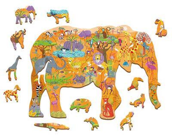 Een houten puzzel in een speciale vorm met hierop afgebeeld een kleurrijk landschap. De puzzelstukjes waaruit de puzzel is samengesteld, bestaan uit 12 voorgevormde dieren die geplaatst kunnen worden op de daarvoor bestemde basis. Het spel stimuleert het logisch nadenken, de visueel-ruimtelijke vaardigheden en de fijne motoriek.