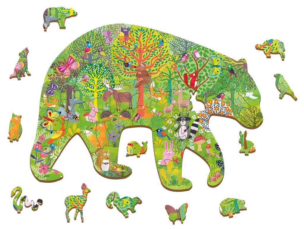 Een houten puzzel in een speciale vorm met hierop afgebeeld een kleurrijk landschap. De puzzelstukjes waaruit de puzzel is samengesteld, bestaan uit 12 voorgevormde dieren die geplaatst kunnen worden op de daarvoor bestemde basis. Het spel stimuleert het logisch nadenken, de visueel-ruimtelijke vaardigheden en de fijne motoriek.