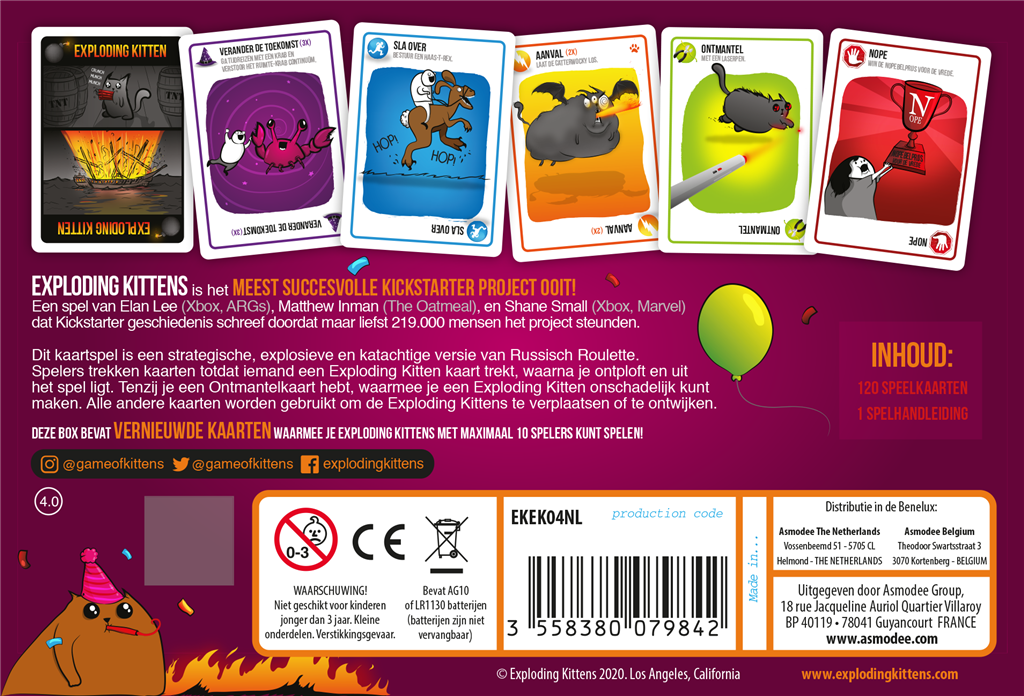 De Exploding Kittens Party Pack bevat een selectie van (vernieuwde) kaarten uit de reeks Exploding Kittens kaartspellen, waardoor het spel nu met maximaal 10 spelers te spelen is. Ideaal voor tijdens een feestje!