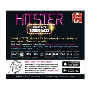 Laat je meeslepen door de magie van filmmuziek met Hitster Movie & Tv Soundtracks! Deze speciale editie neemt je mee op een nostalgische reis door de grootste soundtracks van films en series uit verschillende decennia. Test je kennis terwijl je iconische nummers chronologisch rangschikt en herbeleef de hoogtepunten van film – en tv – historie. Weet jij als eerste 10 nummers in de juiste volgorde te plaatsen? Dan mag jij je kronen tot de ultieme Hitster! Perfect voor fans van muziek, films en een beetje competitie! Deze nieuwste versie van Hitster komt in een kleinere doos met 150+ kaartjes. De ideale uitbreidingsset voor jouw favoriete muziekspel!