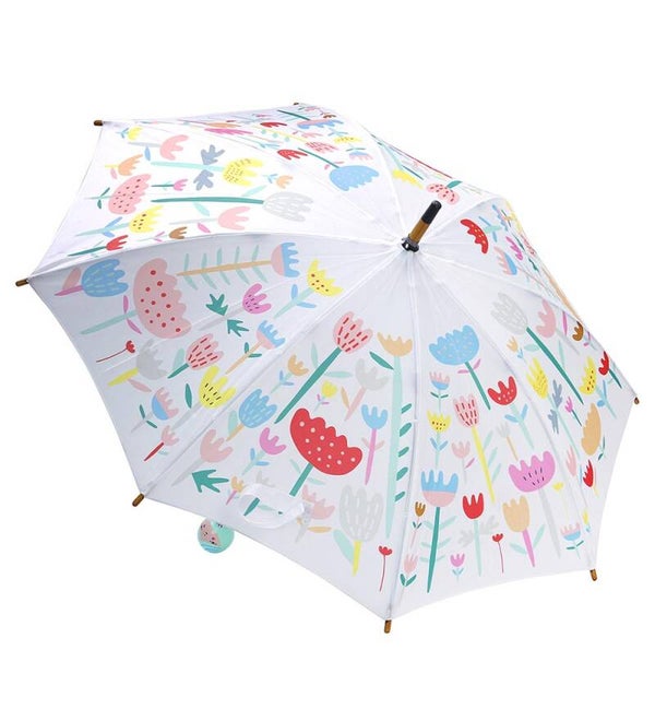 Leuke Vilac paraplu met op de witte kap prachtige bloemen afgebeeld. Het handvat van de paraplu heeft vorm van een bloemenmeisje.