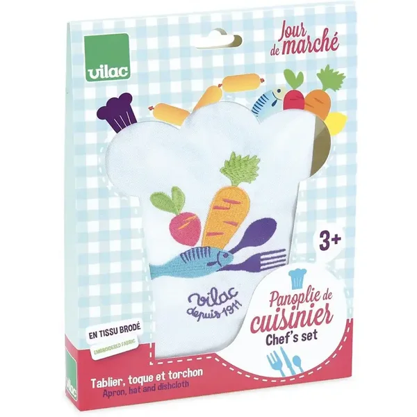 Word een echte chefkok met deze koksset met keukenschort, koksmuts en theedoek zoals de grote chefs.geschikt voor kinderen vanaf 3 jaarafmetingen schort: 80 x 45 cmafmetingen doek: 25 x 32 cmartikelnummer: 7900
