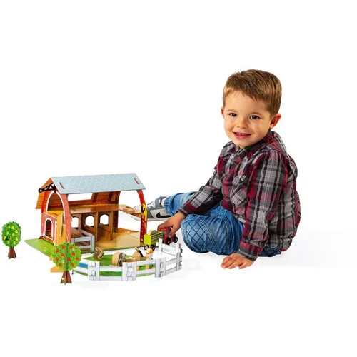 Bevat: een grote boerderij met oprit om de stal te bereiken, een portaal en een omheining, 6 hekken en 10 accessoires van massief hout.