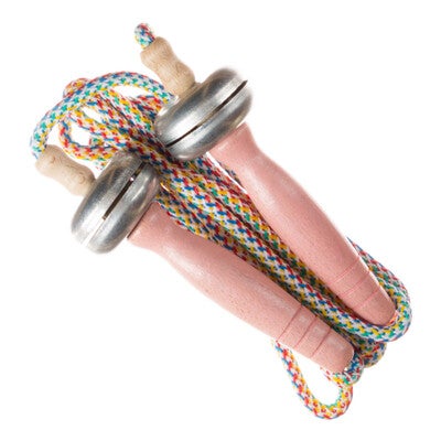 Het springtouw heeft houten handvaten en het gekleurde touw is 2 meter lang.