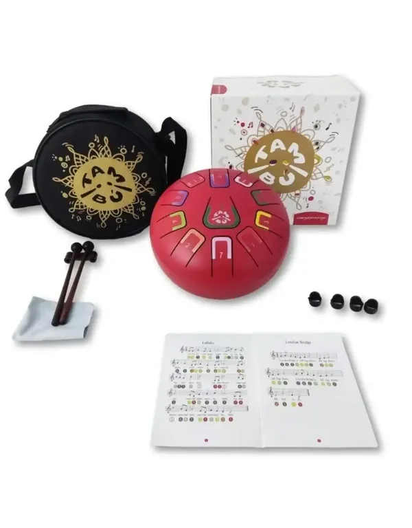 De set bevat: 1x rode TAMBU | 1x muziekboek | 2x drumstokjes | 1x drumstokjeshouder | 4x vingerplectrum