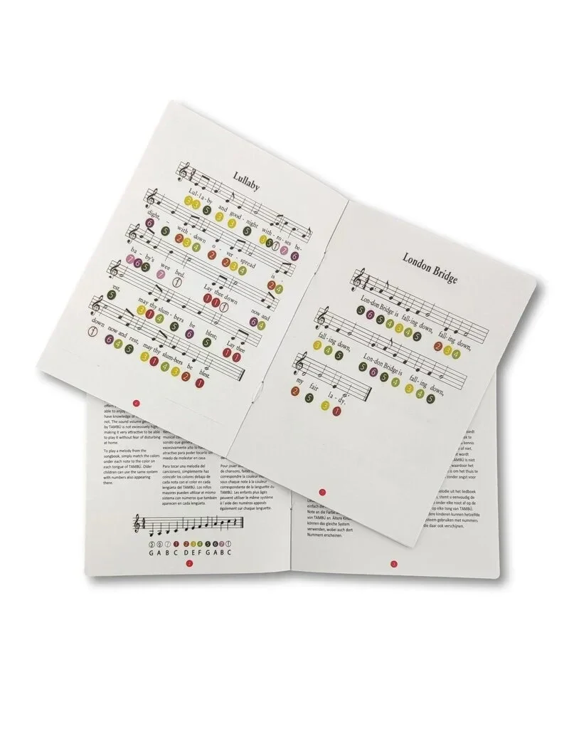 De set bevat ook een muziekboek met meer dan 10 verschillende muziekstukken. Elke noot wordt traditioneel weergegeven en daaronder bevindt zich een gekleurde cirkel met een unieke nummering.