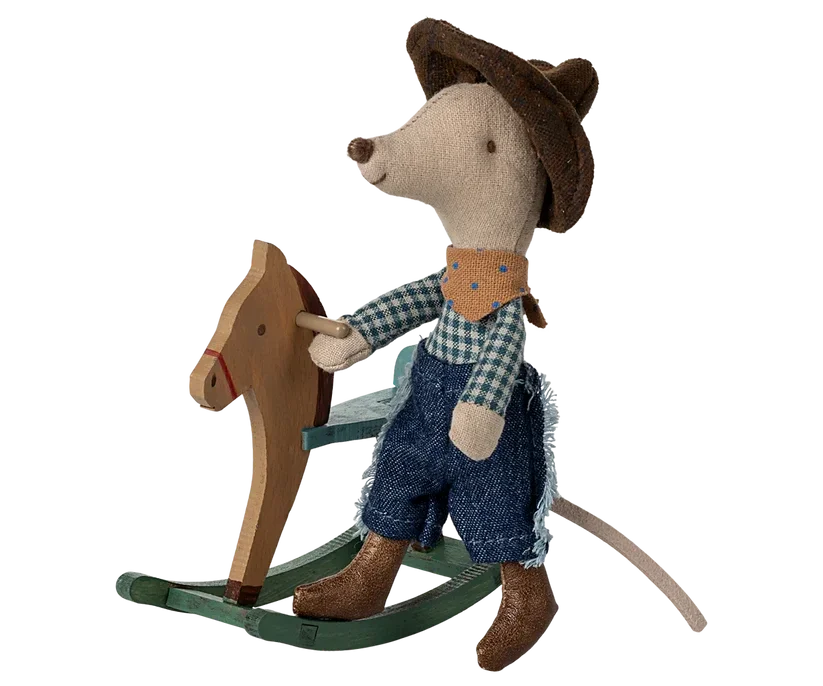 Maileg - Muis op Hobbel Paard, Cowboy Mouse on Rocking Horse - Little Brother
