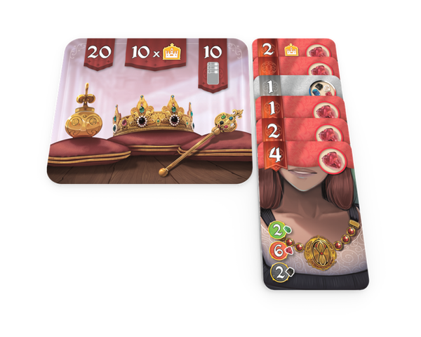 Om te winnen moet je aan minstens één van de drie voorwaarden voldoen die op de overwinningstegel staan weergegeven: 20 of meer prestigepunten, 10 of meer kronen of 10 of meer prestigepunten op kaarten van dezelfde kleur.
