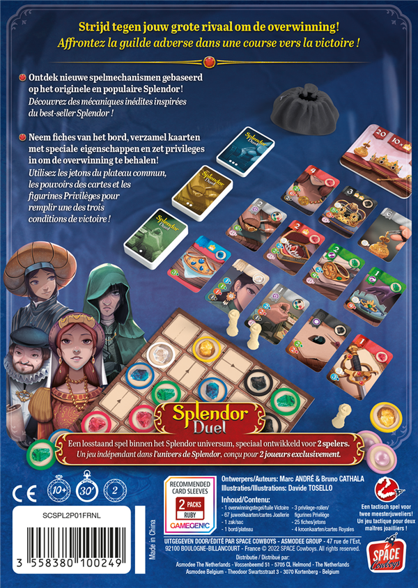 Splendor Duel is een gloednieuw 2-speler spel binnen het Splendor universum met unieke en innovatieve spelmechanismen, ontworpen door Marc Andre en Bruno Cathala.