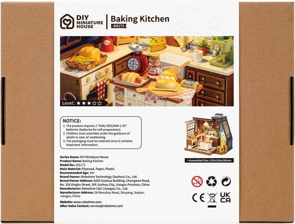 De DG172 Rolife bakkeuken is een bouwpakket van een houten miniatuurhuisje geschikt voor volwassen bouwers en kinderen vanaf 14 jaar. Bouwers die voor deze miniatuurkeuken gaan worden verwend met tientallen schattige details. In deze keuken, waarin interactieve voorwerpen zijn zoals de koelkast, oven en kast die open keuken, zien we een scène waarin lekkernijen worden gebakken. Een buitengewoon vermakelijk bouwpakket.