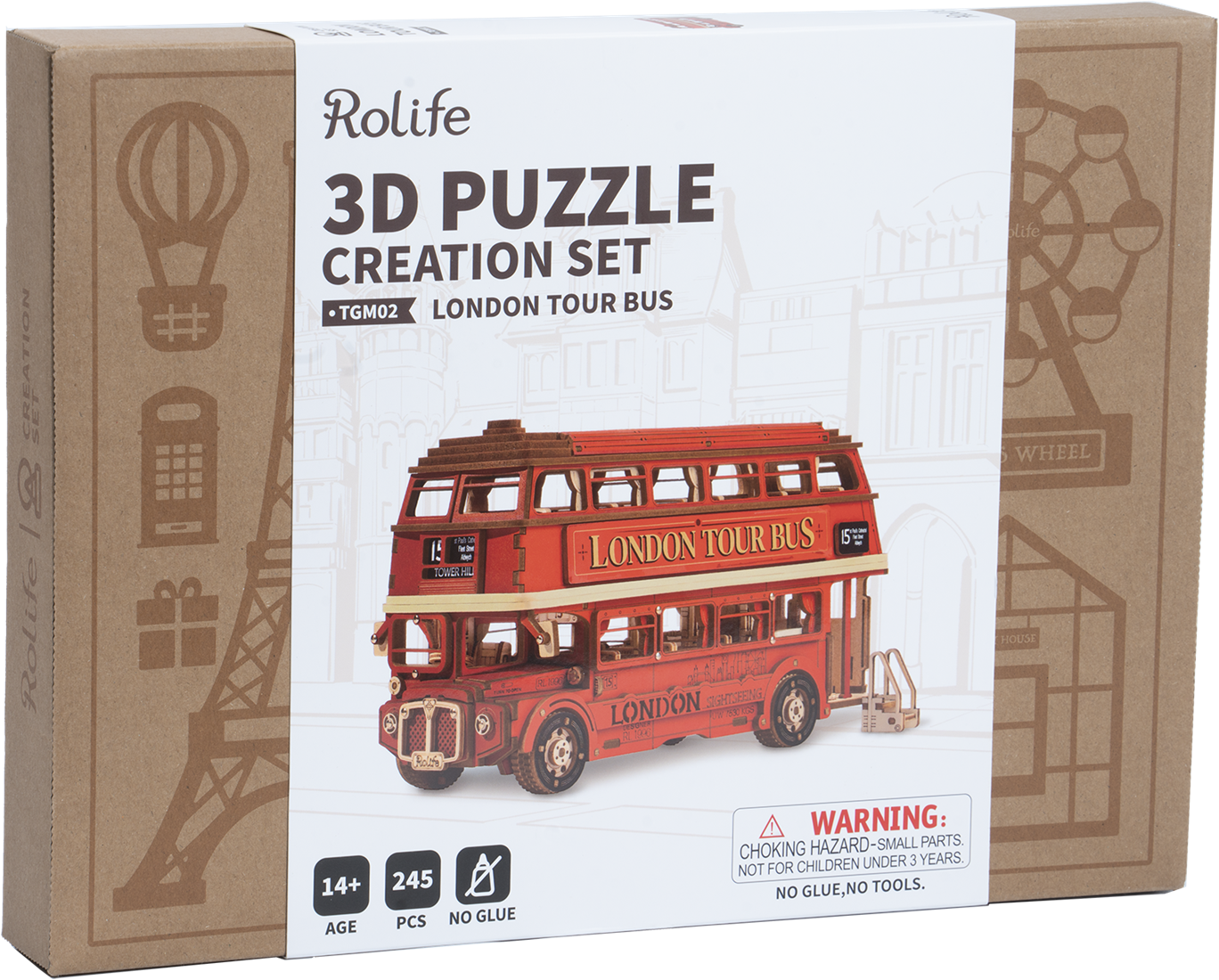 De TGM02 Robotime London Tour Bus is een prachtig houten bouwpakket van Rolife, ontworpen voor volwassenen en kinderen vanaf 14 jaar. Deze iconische rode dubbeldekker rijdt door het hart van Londen, langs bezienswaardigheden zoals St. Paul’s Cathedral, Fleet Street, Aldwych en het levendige Trafalgar Square. Het bovenste deel van deze 3D-puzzel is afneembaar, zodat je het interieur kunt bewonderen, inclusief de gedetailleerde stoeltjes en andere karakteristieke elementen van de Londense toerbus.