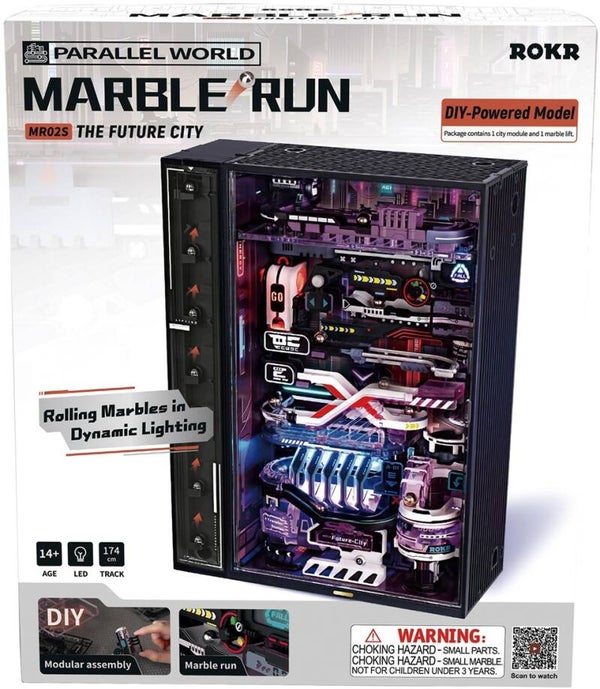 De MR02S Robotime Marble run the future city is een kunststof bouwset voor volwassenen en iedereen vanaf 14+ van een knikkerbaan. Deze indrukwekkende set creëert een futuristische stad met onder andere een U-vormige baan en een totale lengte van maar liefst 174 centimeter! De knikkerbaan is uitgerust met ledverlichting die de felle kleuren en verrassende wendingen van het parcours accentueert.