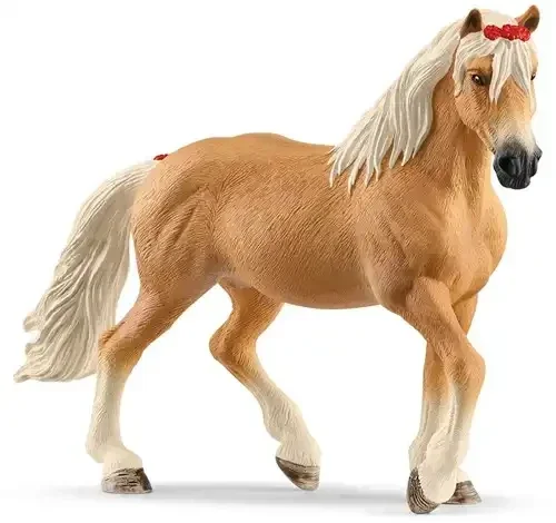 De haflingermerrie kijkt aandachtig rond om te zien of ze de aandacht krijgt die ze wil. Wie kan haar nou missen? Met haar rode strik in die weelderige witte manen ziet ze er zó mooi uit dat ze overal de aandacht trekt.