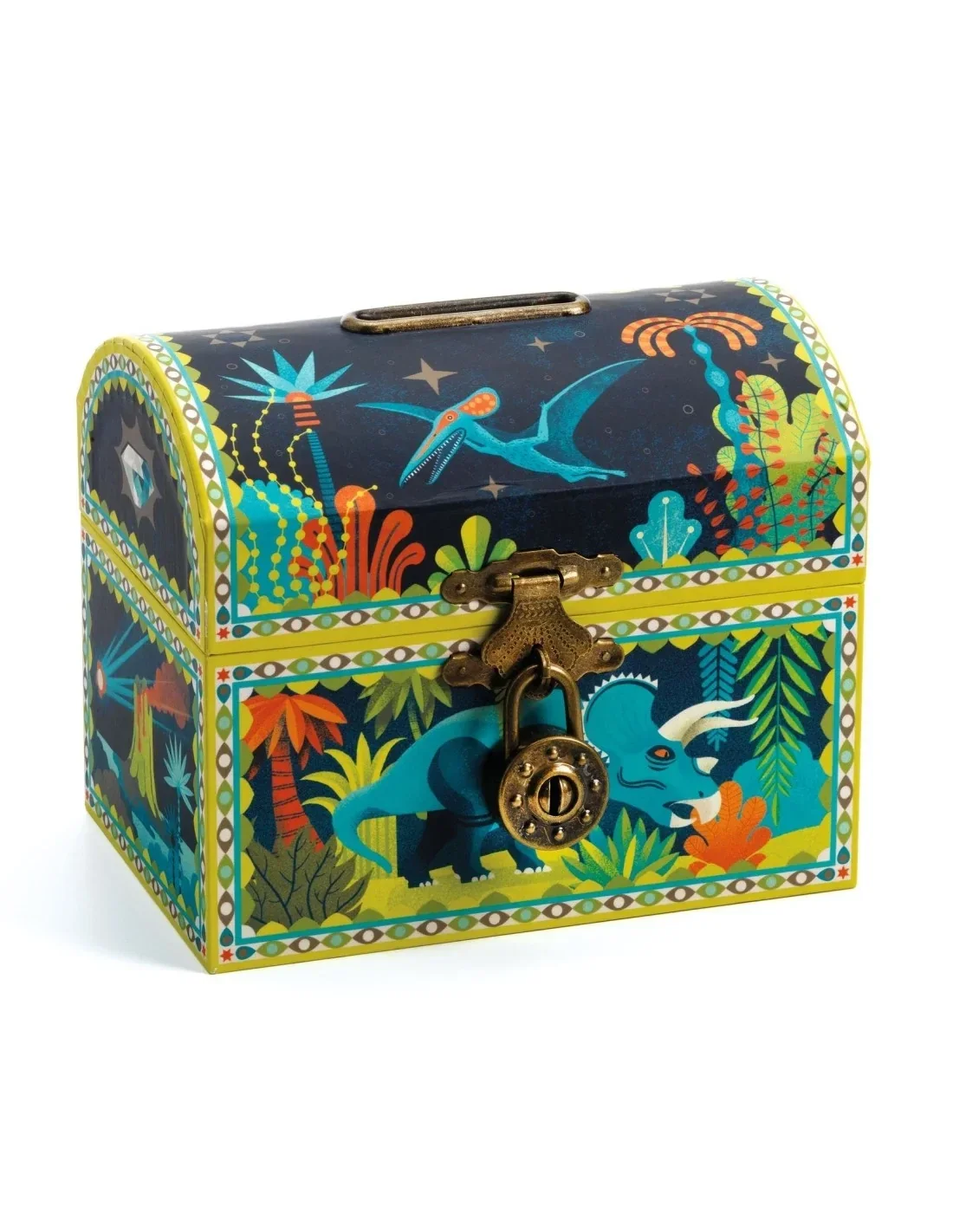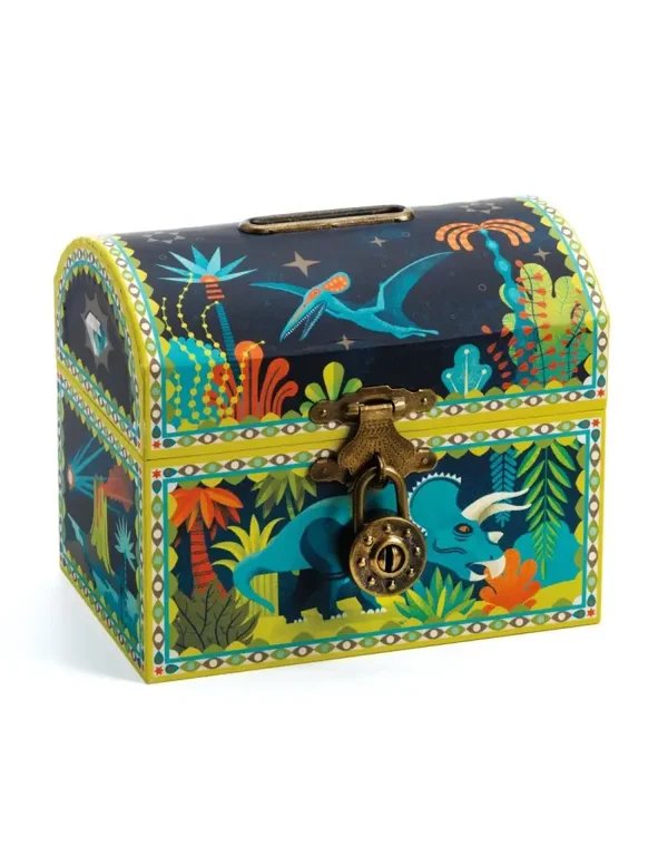 Ontdek deze prachtige spaarpot die ook kan dienstdoen als schatkist. Een prachtig decoratieobject, met idyllische afbeeldingen van dinosaurussen, dat zijn plek zal vinden in iedere slaapkamer. De spaarpot wordt afgesloten met een hangslot en geleverd met 2 sleutels om je spaargeld terug te vinden.
