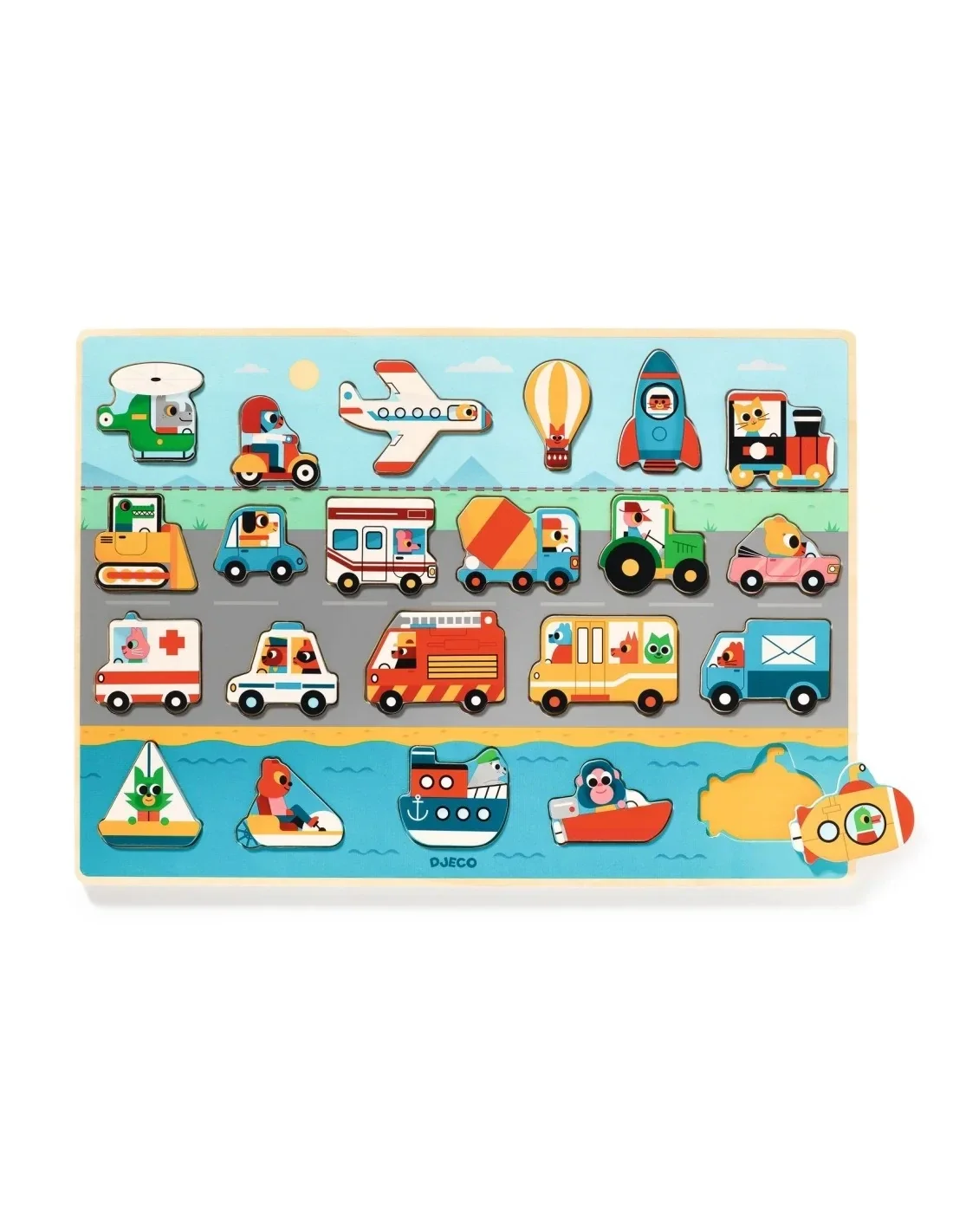 Een houten puzzel 'Puzzlo Vroom' met het thema voertuigen. Je kind plaatst de 22 stukken door de afdrukken van de voertuigen op het bord te herkennen.