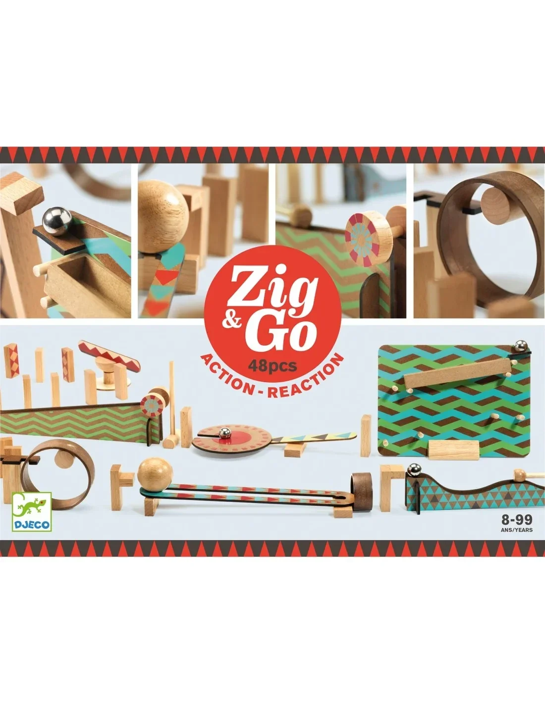 Djeco presenteert Zig & Go, een houten spel met een kettingreactie, puzzelen en bouwen. Het kind volgt de 3 modellen in het boekje om zijn eigen route te bouwen of bedenkt er ontelbare andere. Dit spel voor kinderen vanaf 7 jaar is compatibel met alle sets uit de collectie om nog slimmere actie-reactie route te bedenken!