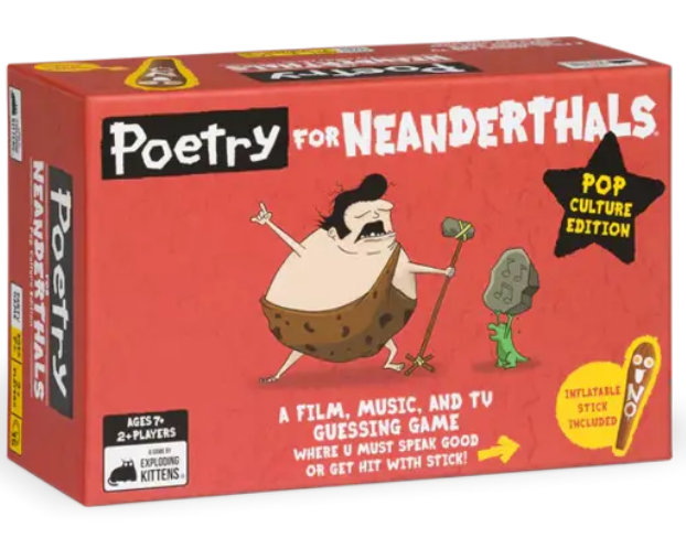 In Poetry for Neanderthals: Pop Culture Edition probeer je bekende popcultuur-termen en begrippen uit te leggen… maar er is een catch: je mag alleen woorden gebruiken van één lettergreep! Zeg je per ongeluk een woord met meerdere lettergrepen? Dan zwaait er wat – letterlijk – met de opblaasbare knots! Een knotsgek partyspel waarin spelers zich inleven als poëtische Neanderthalers. Ideaal voor spelletjesavonden met familie of vrienden, en geschikt voor jong én oud.