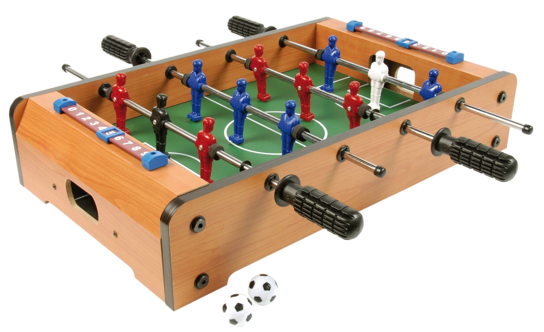 De voetbaltafel is voorzien van 4 doorlopende stangen met rood, blauw, wit en zwarte poppen.