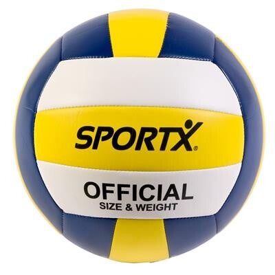 SportX Official volleybal, in wit, geel en blauwe kleurencombinatie. Official size and weight: voldoet aan de door de FIVB vastgestelde kenmerken. Gewicht: 260-280 gram. Materiaal: mat tpu. Diameter: 22 cm. Dikte van de lagen: 3 mm.