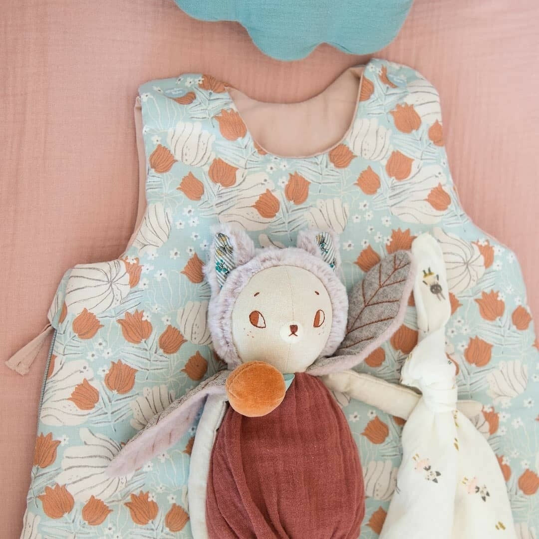 Olwen de poes in crèmekleurige chambray- en jerseystof. Gekleed in een pruimkleurige mousseline-tuinbroek en om haar nek een belletje van kleurige fluwelen badstof. De bladeren van grijze chambray-stof en roze fleece bedekken subtiel haar schouders.